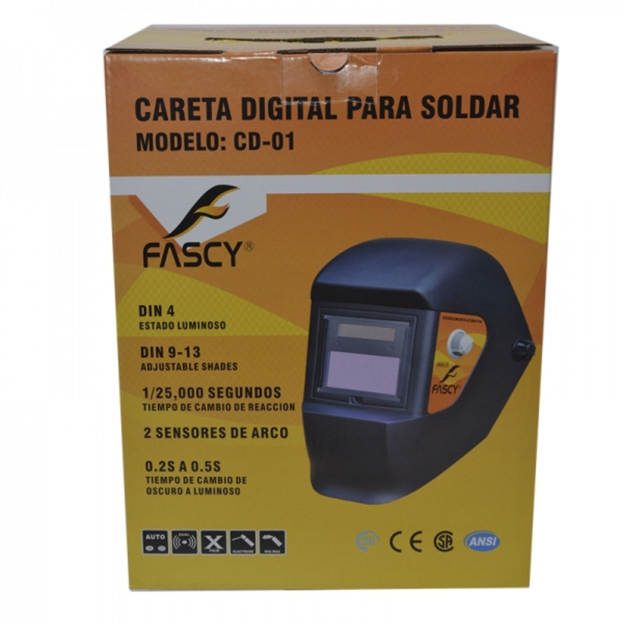 La careta digital para soldar FASCY de oscurecimiento automático está diseñada para proteger los ojos y el rostro de chispas, salpicaduras y las radiaciones nocivas en condiciones normales de soldadura. Los filtros de auto-oscurecimiento cambian automáticamente del estado oscuro al estado transparente, cuando el arco desaparece. Recomendado para herrerías, metalúrgicas e industrias en general.