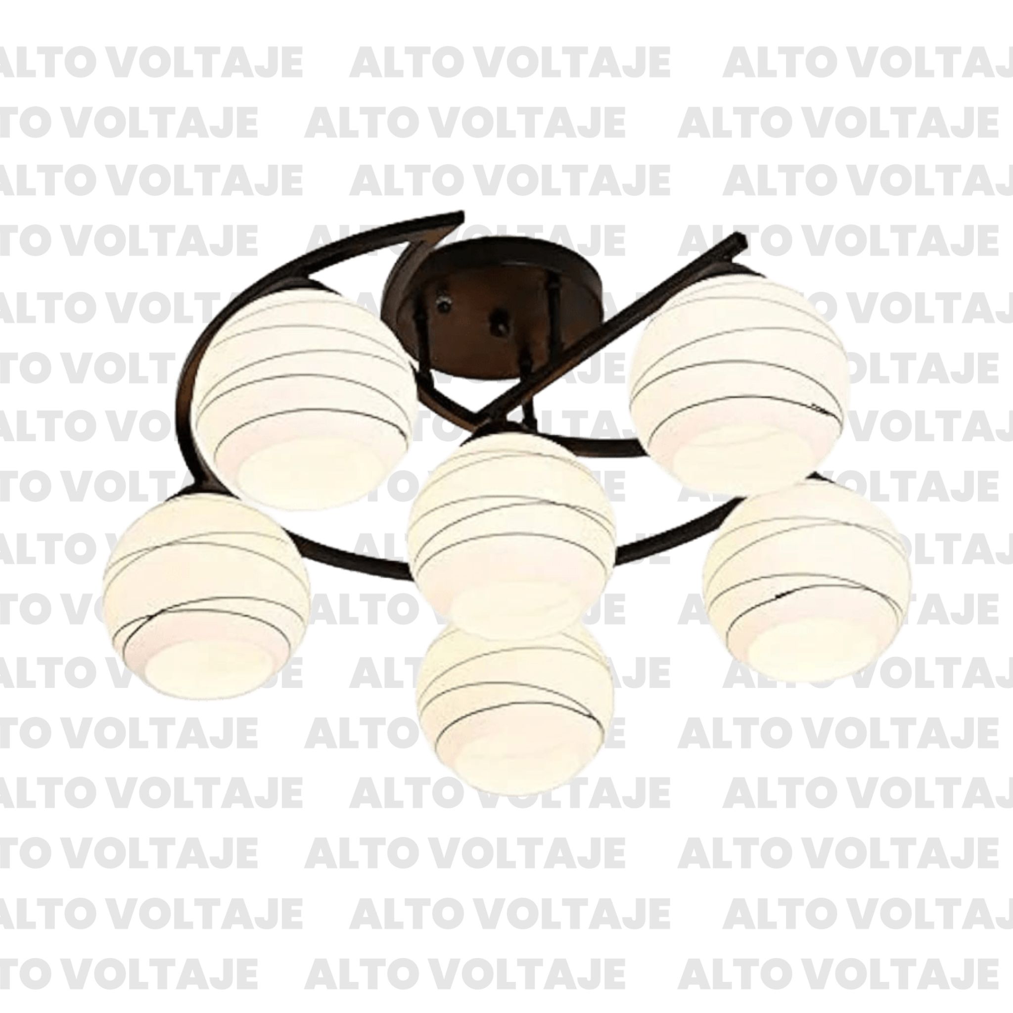Araña fija de 6 luces base negra tulipas blancas rayadas. AV_19260