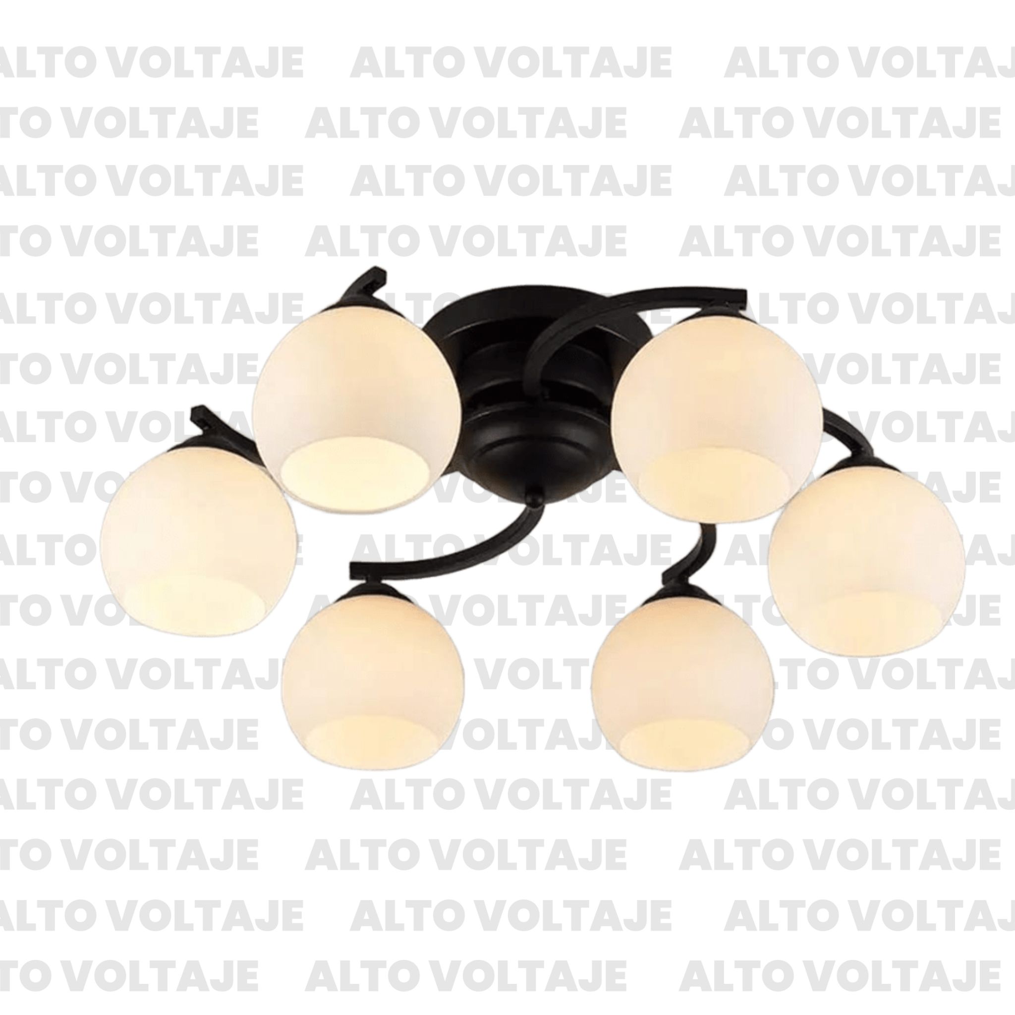 Araña rústica de 6 luces base negra, tulipa blanca. AV_10081